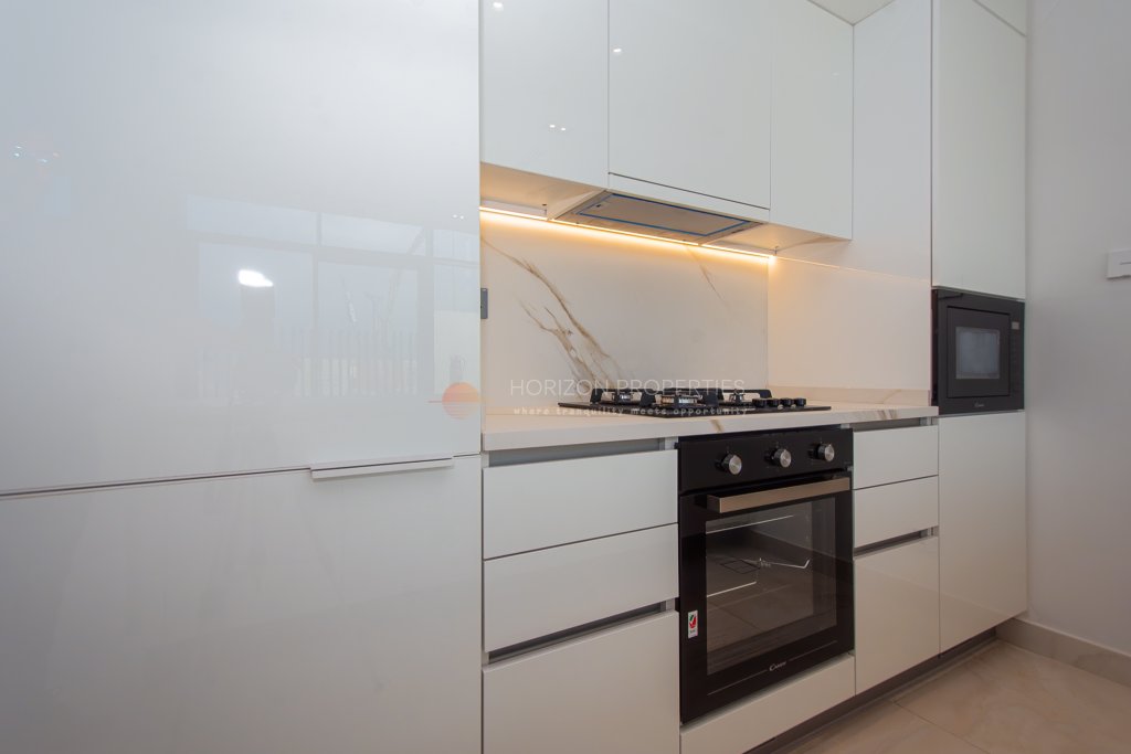 - High-end cabinetry, quality countertops, and integrated appliances.